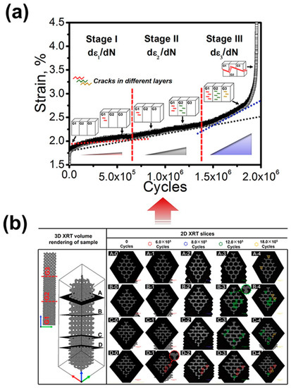 (a) strain-cycle curves of the graded mesh, (b) XRT images of the graded meshes which are corresponding to the arrow points shown in (a). 2D slices A, B, C, and D are located at the G3, G2, and G1 part is shown specifically sitting in the volume rendering of the sample. The numbers 0, 1, 2, 3, and 4 are in accordance with the 5 arrow point, respectively. The colored dash cycles in (b) indicate the sites of the cracks observed at each arrow point [101].