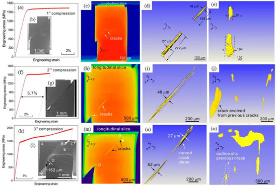 Shear band cracking behavior in an in situ compression test. The compression, SEM, and XRT results in the rows after the first stop (a–e), after the second stop (f–j), and after the third stop (k–o), respectively [107].