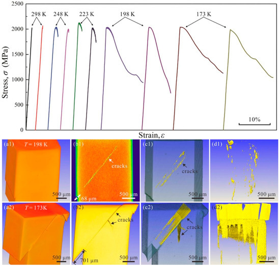 Typical engineering stress–strain curves under compression at temperatures from 298 K to 173 K showing the influence of testing temperature on the stress-strain behavior of Ti32.8Zr30.2Ni5.3Cu9Be22.7 metallic glass and the XRT results corresponding to the samples at 198 K (a1–d1) and 173 K (a2–d2). (a1–a2) the global 3D volume renderings of the samples. (b1–b2) 2D slice or cross-section showing the internal cracks well located in the shear band plane. (c1–c2) and (d1–d2) 3D extracted internal cracks observed from different perspectives. The XRT volume renderings together with the 3D internal cracks show the temperature effect on the deformation of the MG sample [115].
