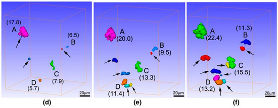 XRT volume renderings of micro-pores in a same sample with a heat treatment at 1603 K for (a) 0 h, (b) 1 h, (c) 4 h, (d) 7 h, (e) 12 h, and (f) 20 h. The equivalent diameter (μm) of the S-pores is also given [118].
