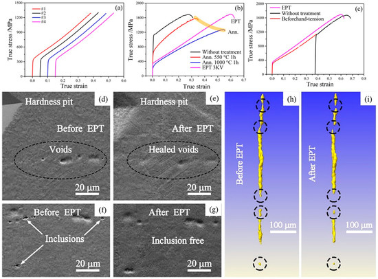 Twinning-induced plasticity (TWIP) steel, as a future candidate for the aerospace industry, greatly combines high tensile strength and uniform elongation by means of the high strain-hardening capacity. If TWIP steels are subjected to plastic deformation, the initiation of micro-voids could undermine the strain-hardening capability and result in premature failure. Improving the mechanical properties is expected by eliminating the micro voids using electropulsing treatment (EPT) [120]. Figure 6a–c shows an interesting phenomenon where EPT could recover the strength and plasticity, but annealing treatment had no such ability. The evidence on the sample surface as shown in Figure 6d–g proved that the voids could indeed be healing as well as that the inclusions could be eliminated by EPT. This led to the increase of the strain-hardening capability and resulted in the recovery of strength and plasticity of the TWIP steels samples when compared with those annealed counterparts. One may doubt that the void healing effect may be a pseudomorph on the sample surface due to the quasi in situ processing.