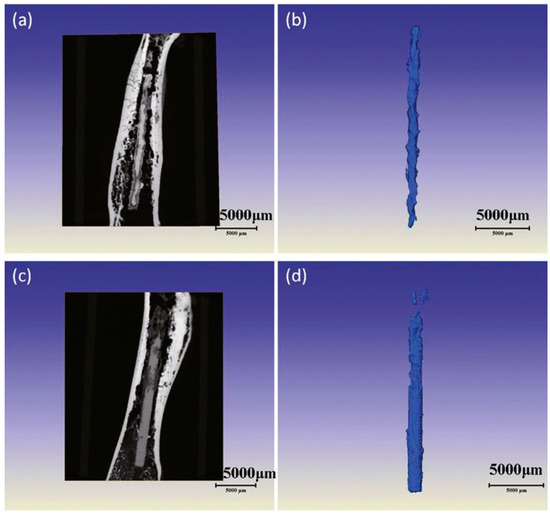 Since in vitro degradation measurements including mass loss, hydrogen evolution, and electrochemical behavior cannot draw complete maps for the in vivo status, 3D XRT with a pixel size of 25.94 μm was applied to visualize the in vivo degradation amount of the distal femora of rabbit at the implantation periods of eight weeks post-surgery. The dimensions of the rods for the MAO-coated Mg–Sr alloy and the control Mg–Sr alloy without coating were Φ 1.5 mm × 20 mm.