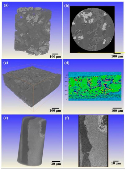 In addition to the ability to show the internal structure of a wide variety of materials in static states, the capability of XRT to set test conditions facilitates two paralleled processes of both 3D imaging of internal structures and measurement of properties in dynamic states. Their relationship can be correlated more easily and directly. Pioneering works of the in situ XRT in materials science can be traced back to the 1990s. Guvenilir et al. investigated the crack evolution in an aluminum–lithium alloy employing XRT combined with in situ loading experiments [27]. Since then, the damage inside materials induced by processing, cycling, or deformation have been investigated from 3D viewpoint. Vivid 3D structures of materials and quantitative analysis of the temporal state provide valuable insights as material properties rely on microstructure evolvement. Research works are still very active and versatile in the experimental mechanics field. Deformation and fracture are still common interest for metals and alloys [28,29,30,31,32,33,34,35,36,37,38,39,40,41,42], foams and porous materials [11,14,43,44,45,46], and composites [13,47,48,49]. XRT has also been considerably extended with other in situ measurements including materials processing [50,51,52,53,54,55], materials interaction with specified conditions involving extreme temperature [56,57], corrosion [58,59,60], electrochemical environments, as in batteries [61,62,63], etc. The finite element (FE) method has also been employed to analyze the dynamic processes with the change of applied fields based on 3D models from XRT [16,64,65,66]. Detailed reviews have also been published on in situ XRT for materials science [20,67], which clearly shows the fast growth of the technique in the past two decades. Such in situ experiments usually provide comprehensive 3D quantitative data and related properties or the performance of materials.