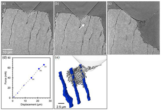 The crack growth in the dentin of elephant tusk under nanoindentation was investigated. It provided insights into anisotropic fracture behavior and crack-shielding mechanisms. In this in situ experiment, a cone indenter with a tip radius of 1 μm and tip angle of 90° was used to initiate and propagate cracks on a cone shape dentin sample with the height of 1 mm and top surface diameter of 50 μm. The load was applied incrementally and held in a manner of displacement control at different stages (Figure 10a–c). Zernike phase contrast mode was used with 721 projections. Each projection was exposed for 60 s with 64 nm pixel size. Figure 10a–c present continuous crack propagation as the indentation was increased. Further information was obtained from the 3D segmented image (Figure 10e). The extension of the crack was mainly in a radial direction from the indenter, which seemed to be a crack path with low energy. A deflecting crack path could also be deduced from the cracks growing in other directions. Therefore, cracking and bridging seem to be the main fracture toughening mechanisms of tubules for the tusk. This example demonstrated that enhanced insight on material performance was no longer limited in synchrotron-based X-ray tomography, and could be explored through lab-based X-ray nano-tomography.