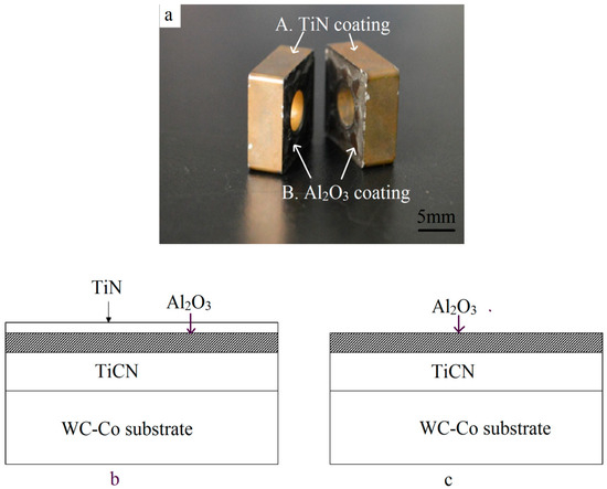 Multilayer coating on the multicomponent substrate. (a) Macrograph; (b) schematic of the TiCN/Al2O3/TiN coating on four flanks; and (c) schematic of the TiCN/Al2O3 coating on the two front surfaces.