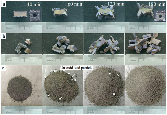 Macrographs of samples oxidized at 900 °C in air for different times. (a) Untreated samples; (b) fragmented samples; and (c) milled powders.