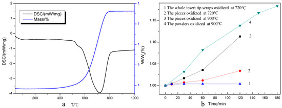 To examine the optimal oxidation temperature, thermal analysis was employed with air flow. The TG-DSC results are shown in Figure 4a. The mass fraction indicates the total weight of the oxidized samples as a percentage compared to the initial weight. It can be seen that the weight changed obviously with increasing temperature after 400 °C and increased sharply around 720 °C. This means that oxidation began at around 400 °C, so the theoretical oxidation temperature for recycling the WC-Co cemented carbide scrap should be 720 °C. As shown in Figure 4a, the TG curve remained almost flat when the value of the mass fraction reached 118.20%, which as consistent with the theoretical calculation value when fully oxidized, indicating that the weight gain was about 18.20% when fully oxidized [19].