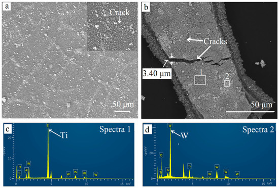 After oxidation for 60 min, more pits were found on the surface (Figure 8b). The outermost coating became uneven and porous. Furthermore, many cracks were presented and could be seen clearly in the magnified image on the left. The stress that appeared when isothermally heated at 900 °C was the main reason for more defects. Defects provided fast paths for the element diffusion. Oxygen diffused to the inner TiCN coating and inside the substrate through cracks and pits. Meanwhile, the elements inside were out-diffused. Some white oxide particles were piled up on the surface along the cracks. Some cracks were even healed by the white particles. After oxidation for 300 min, more and deeper cracks could be found. The widest crack exceeded 3 μm (Figure 8b). As shown in the EDS results (Figure 8c,d), the elements W was tested in the white particles and implies that W out-diffused to the surface.
