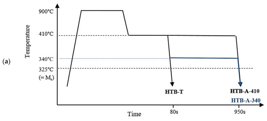 HTB was isothermally formed at 410 °C (683 K), i.e., Ms + 85 °C. At this temperature, the transformation was completed after 80 s. The sample in the “transformed” state (HTB-T) was directly quenched after the transformation was finished. Two additional samples were further aged without any intermediate quench (In contrast to standard definition, the “aged” condition is here obtained without intermediate cooling): sample HTB-A-410 was maintained at the transformation temperature for 870 s and sample HTB-A-340 at 340 °C (613 K) for 870 s (see Figure 1a and Table 1a).