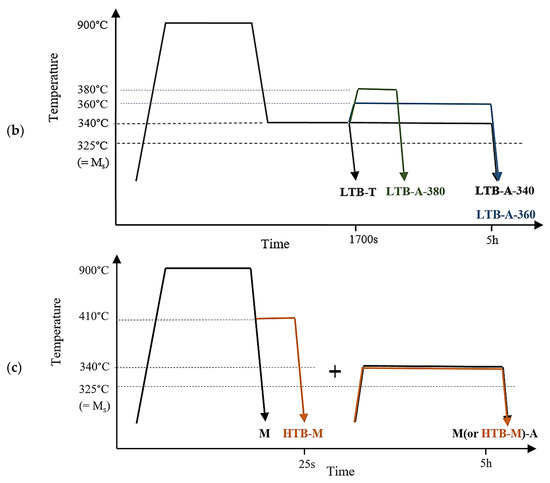 LTB was isothermally formed at 340 °C, i.e., Ms + 15 °C. At this temperature, the transformation was completed after 1700 s. The sample in the “transformed” state (LTB-T) was directly quenched after the transformation was finished. Three additional samples were further aged at different temperatures, without any intermediate quench: sample LTB-A-340 was maintained at the transformation temperature for 5 h, sample LTB-A-360 at 360 °C for 5 h and sample LTB-A-380 at 380 °C for 1800 s (see Figure 1b and Table 1b).