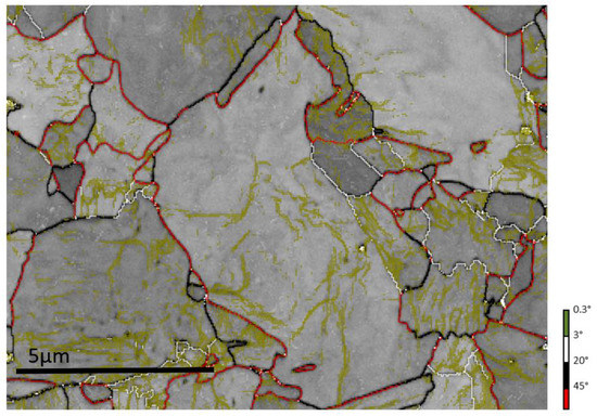 Enlarged area taken from the EBSD map of the HTB-A-410 highlighting in green very low disoriented sub-boundaries (between 0.3° and 3°) present in the granular structure. The lath structure has completely disappeared after this granularization process.