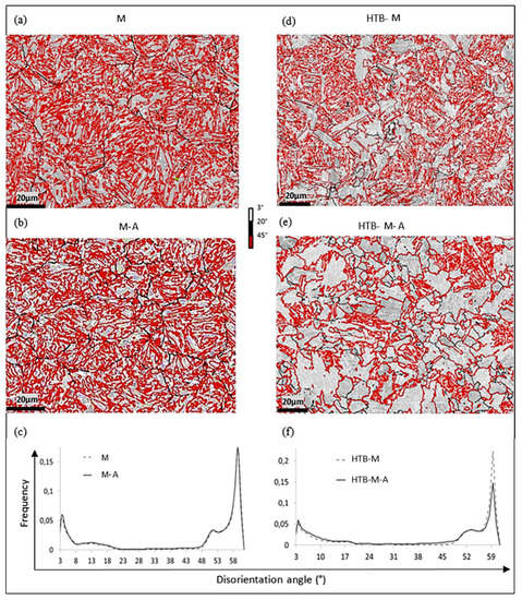 Angular disorientation maps (with the associated color code shown on the figure), comparing: M (a) with M-A (b); and HTB-M (d) with HTB-M-A (e). (c,f) Angular disorientation histograms associated with EBSD data.