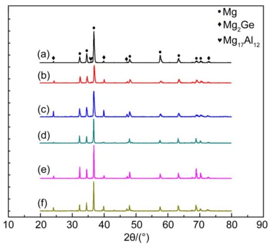 XRD pattern of Mg-3Al-xGe alloy. (a) AG31, (b) AG33, (c) AG35, (d) AG31H, (e) AG33H, and (f) AG35H.