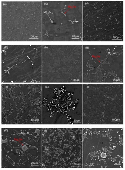 Microstructure of Mg-3Al-xGe alloy. (a) AG31, (A) high magnification AG31, (b) AG33, (B) high magnification AG33, (c) AG35, (C) high magnification AG35, (d) AG31H, (D) high magnification AG31H, (e) AG33H, (E) high magnification AG33H, (f) AG35H, and (F) high magnification AG35H.