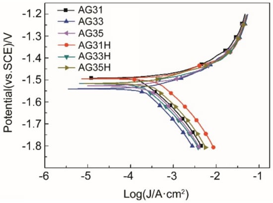 Figure 3 shows the polarization curves of the as-cast and solid-solution Mg-3Al-xGe alloy in 3.5 wt% NaCl solution. It can be seen from the Tafel curve that the corrosion current density (icorr) in the anode region of the polarization curve is basically the same, and the icorr in the cathode region changes greatly, indicating that the corrosion processes are controlled by the hydrogen evaluation reaction of cathodic sides []. Besides, the anodic current density increased steadily with the applied potential for all specimens, indicating the active dissolution of Mg. None of the specimens exhibited a passive region. The fitting results of the polarization curves are listed in Table 3. According to Table 3, the icorr values of the solid-solution Mg-3Al-xGe alloys is higher than that of corresponding as-cast specimens, which demonstrates that the as-cast Mg-3Al-xGe alloy exhibits a lower corrosion rate than solid-solution Mg-3Al-xGe alloy. The icorr values of the as-cast and solid-solution Mg-3Al-xGe alloys have the same changing rule; that is, the icorr of AG33 alloy is the smallest, that of AG31 is the largest, and that of AG35 is in-between. This indicates that the corrosion rate of AG33 is the lowest and the corrosion rate of AG31 is the highest. However, the corrosion potentials (Ecorr) of these alloys are concentrated within a small range, and the Ecorr gradually becomes negative as the Ge content increases.
