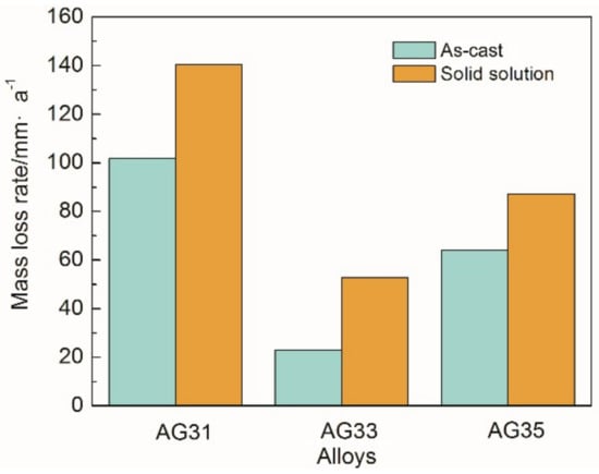 Moreover, the corrosion resistance of Mg-3Al-xGe alloys was investigated by immersion tests in 3.5% NaCl solution for 18 h. Figure 4 shows the mass loss rate of as-cast and solid-solution Mg-3Al-xGe alloys. It was found that the mass loss rate of the three as-cast and solid solution specimens is in the order of Mg-3Al-3Ge (23.081 mm·a−1 and 52.889 mm·a−1) < Mg-3Al-5Ge (63.974 mm·a−1 and 87.298 mm·a−1) < Mg-3Al-1Ge (101.734 mm·a−1 and 140.524 mm·a−1), indicating a decrease in corrosion resistance in the same order. Similarly, as-cast Mg-3Al-xGe alloys present better corrosion resistance than that of corresponding solid-solution specimens. The mass-loss rate results are in good agreement with the polarization curves and hydrogen evolution data. The above results imaged that the alloy with alloying element content have discriminating corrosion resistance, ascribed to the precipitations of the second phase.