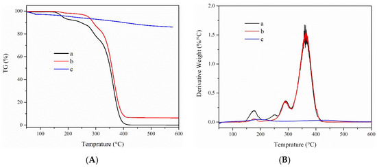 Thermo-gravimetry (TG) curves (A) and DTG curves (B) of PMMA, poly(OPal-MMA), and OPal. (a) PMMA; (b) poly(OPal-MMA); (c) OPal.