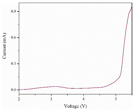 The electrochemical window of the poly(OPal-MMA) electrolyte was studied using linear sweep voltammetry (LSV) at a scan rate of 0.5 mV·s−1 with an electrochemical cell. The cell was assembled in an argon-filled glove box, which consisted of an SS working electrode and lithium metal (reference electrode), as well as a counter electrode in a CR2032 coin-type cell.