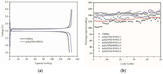 In order to study the electrochemical stability of poly(OPal-MMA), the charge–discharge has been investigated, and the results are shown in Figure 5. Figure 5a presents the initial charge–discharge capacities of the Li/poly(OPal-MMA) electrolyte/LiFePO4 cell and the Li/PMMA electrolyte/LiFePO4 cell at a 54 μA/cm2 current density (corresponding to a C/10 rate). All the charge–discharge curves of the cells showed a flat plateau between 3.4 and 3.5 V, which is a typical characteristic of LiFePO4 [5]. Generally, the theoretical specific capacity of a LiFePO4 battery is 170 mAh/g [31,32]. Figure 5a also shows that the charge capacity of the Li/poly(OPal-MMA) electrolyte/LiFePO4 cell is greater than the discharge capacity. The irreversible capacity loss might be related to the delithiation process in the LiFePO4, the generation of the passivation layer at the lithium anode, and an increase in the internal resistance [33,34,35]. When the OPal concentration was 5%, the highest initial charge–discharge capacity of the cell was 147.57 mAh/g and 146.36 mAh/g, respectively, and the coulombic efficiency was 97.3%. Generally, battery coulombic efficiency is related to metallic lithium plating and its subsequent corrosion, as well as the formation and growth of a solid electrolyte interface film, and so on. [18]. Many studies have reported that PMMA can reduce the interface resistance and contact resistance between the electrolyte and the electrodes [16,18,34,36]. Cells that can absorb more electrolyte, and also have good interface compatibility between the polymer electrolyte and the electrodes will have an increased charge–discharge capacity. Figure 5b shows the cycle discharge capacities of the Li/poly(OPal-MMA) electrolyte/LiFePO4 cell. The discharge capacities of the cells with different separators were between 133 mAh/g to 147 mAh/g, and the capacity of the Li/poly(OPal-MMA) electrolyte/LiFePO4 cell was very stable. The capacity of the Li/poly(OPal-MMA)-5 electrolyte/LiFePO4 cell was 146.35 mAh/g after 50 cycles, and the decaying rate was as low as 0.02% per cycle.