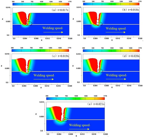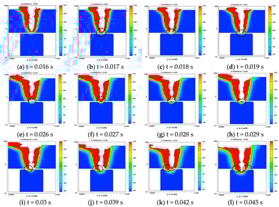 (2) When the laser goes though gap, the wall of keyhole is opened and closed continuously. The vibrating time of keyhole is approximately 0.029 s (from t = 0.016 s to t = 0.045 s). After finishing the vibration, the welding is stable, which is the same as common unfull penetration.