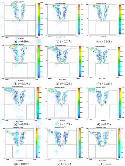 To prove whether the gap presence will produce effects on the pores when the face sheet is penetrated, the corresponding velocity field is given in Figure 5. The fluid presents larger velocity in the surface of keyhole. At t = 0.018 s, the keyhole goes through the face sheet when the largest value of velocity in the pool gets smaller compared to without penetration. From t = 0.018 to t = 0.03 s, the velocity becomes smaller while the fluid quickly connects the face with core. The direction of velocity is down in the lower pool and up in the top pool during the entire penetration welding. This velocity field, which is similar to the full penetration, can drive all the air out of the pool. At t = 0.042 s, the face and core sheet connect and the maximum velocity locates in the original gap. Then, the maximum velocity gets smaller as the welding depth increases after connection.