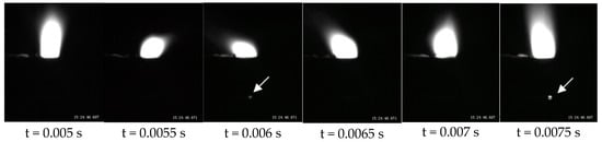 Two experiments were conducted to verify the simulation. According the previous simulation, the pool was discontinuous during penetrating the gap. Thus, in the experimental welding process, some plasma was observed through the gap according to the pool repeatedly being continuous and discontinuous. When the pool was discontinuous, the plasma escaped from pool, which was captured by the camera. Figure 6 shows the plasma images with the gap presence of 0.2 mm. The gap is marked by the arrow. The plasma shown in the gap appeared discontinuously and could not always be seen. When the plasma was observed, it indicated that the pool is cracked (Figure 3). At this time, there is no fluid in the gap. Then, the plasma is not seen, indicating that the fluid surrounds the keyhole. Moreover, the frequency of connecting and disconnecting is 0.002 s, which is the same as the simulation. This phenomenon agrees well with simulated results and verifies the discontinuous connection of pool in the gap.