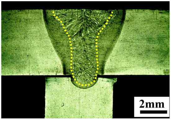 The other experimental verification was observing the cross-sectional welding performance under the simulated parameters. After finishing the welding with the same parameters, the cross-sectional profiles of welding bead were cut and observed using a Zeiss optical microscope (Carl Zeiss, Jena, Germany). Many cross-sections were polished and etched with nitric-alcohol solution, but few pores were found in the gap location, as shown in Figure 7. This also indicates the simulated thermal field is reasonable.
