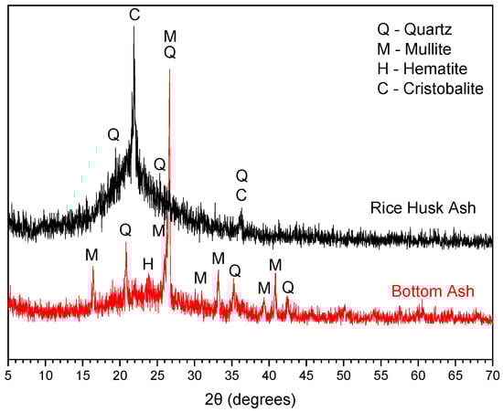 The BA and RHA contained >40% reactive SiO2 and the content of vitreous phase was >50% [,]. The average particle sizes were below the diameter of OPC—8.59 µm and 10.49 µm for BA and RHA, respectively. The specific areas of the RHA and BA ashes were compared with OPC (500.5 m2/kg), with values of 1174 and 715.5 (m2/kg), respectively. Figure 2 shows the X-ray diffractogram of BA after treatment and the RHA. RHA ash contains mainly amorphous materials, with crystalline phases of cristobalite (PDF#39-1425) and quartz (PDF#46-1045). The RHA particles had an irregular shape and were lamellar and fibrous, with presence of elongated particles, due to the unburned material, with lengths of around 150 µm (Figure 3). BA mainly contains quartz crystals, mullite, and hematite, with mostly spherical particles and unburnt carbon (loss on ignition (LOI) = 6.67%).