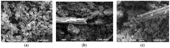 The grinding of the BA particles promoted a reduction in the internal porosity, the formation of irregular particles, and the presence of microspheres (Figure 3a). The RHA particles exhibit irregular, lamellar, and fibrous materials related to the presence of unburned material (Figure 3b).