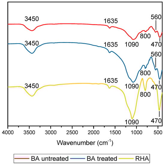 FTIR spectroscopy was facilitated using an Agilent Cary 600 instrument at frequencies between 4000 and 400 cm−1. Figure 4 shows the FTIR results for the minerals (treated and untreated BA and RHA). The wide band located at 3600 to 3200 cm−1 for both samples was due to the O-H bond. The band close to 1600 cm−1 corresponded to the angular deformation of the H-O-H bond in the raw materials. The band present at 1200 and 800 cm−1 was due to the stretching vibration of amorphous Si-O-Si, which showed a higher content to RHA due to its transmittance. The small band close to 500 cm−1 for BA was due to crystalline Si-O-Si. The band at 560–550 cm−1 can be associated with the octahedron present in the mullite. The BA heat treatment at 600 °C increased the intensity of the O-H band and the peak at 1551 cm−1 appeared because the strongest vibration was the C-O bond.