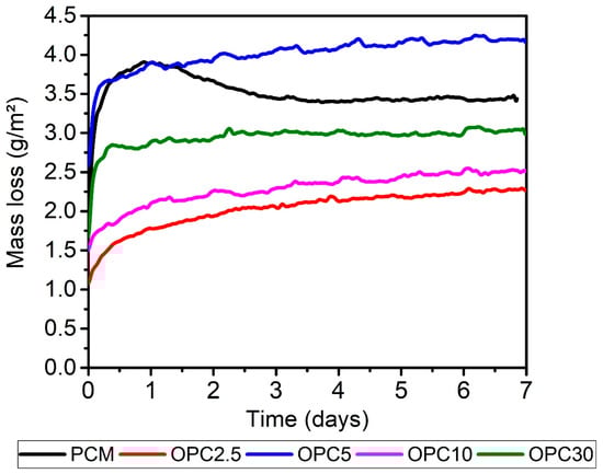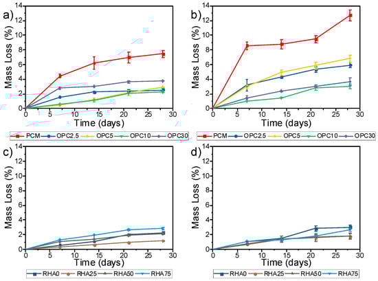 Figure 5 shows that the mass loss was higher for the binary mixes compared with the ternary. This is due to the attack on the OPC, the (N,C)-A-S-H gel, and the alkaline activation BA gel (N-A-S-H). It can be noted that the mixes containing 2.5% and 5% of OPC showed a significant degree of degradation, indicating that OPC content affected the resistance of the acid attack. In the mortars containing RHA, the degree of degradation was lower. Comparatively, the results show that the Portland cement mortar (PCM), with the same w/c ratio, degraded more aggressively than the AAMs. For the AAM, no signs of surface deterioration were found in the visual inspection of the prisms. The OPC specimens were severely deteriorated after the 28 cycles.