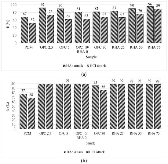 All the hybrid mixtures showed a higher resistance to acid when compared with mortar consisting of only Portland cement. That happened because the absence of aluminum in the main reaction formed. The presence of aluminum within Na+ ions increased the acid character of gel, improving stability in an acid medium C-S-H gel, derived from OPC hydrated with water []. A second hypothesis was that the acid attack decalcifies the AAM, resulting in the formation of calcium acetate and an aluminosilicate gel layer that prevents acid penetration [,]. This fact indicated that higher calcium content resulted in lower mass loss, as observed in Figure 10.