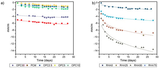 Drying shrinkage: (a) Binary mortars; (b) Ternary mortars.