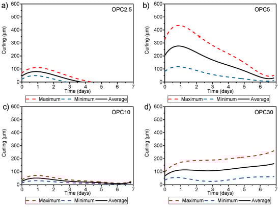 Curling over the time for binary mortars screeds. (a) OPC 2.5 mortar mix; (b) OPC 5.0 mortar mix; (c) OPC 10 mortar mix; (d) OPC 30 mortar mix.