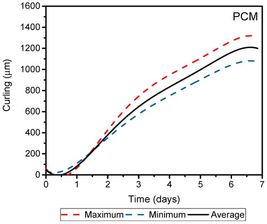 Figure 8 shows screeds warping in binary mortars. Figure 9 shows mortars comprised only of Portland cement mortar (PCM), with same w/c ratio as alkali-activation (0.55). In addition, the maximum, minimum, and average value of each analyzed warpage is shown in Figure 9.