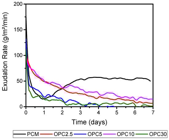 Figure 11 shows the exudation rate in g/m²/min of the mortars. This calculation was performed using the ratio of mass, which was obtained through its variation using the superficial area of the screeds (33 cm × 33 cm). Similar behavior was observed within the variation of mixtures masses, displaying higher rates for the mortar of OPC 5, OPC 30, OPC 10, and OPC 2.5 respectively. PCM presented a higher exudation rate.