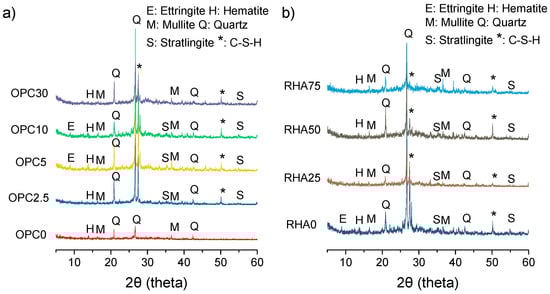 Figure 12 shows the X-ray diffractogram patterns for the alkali-activated samples (at 28-days), which reveal the presence of quartz crystals (PDF# 46-1045) and mullite (PDF# 15-0776), due to the unreacted material. The presence of a significant amorphous content can be noted by the halo formed between 2θ at 25–30°, which increased as the contents of OPC increased. Ettringite (PDF# 41-1451), Stratlingite (PDF# 29-0285), and C-S-H (PDF# 42-538) peaks were observed for samples with over 10% of OPC, due the normal hydration of OPC. No C-A-S-H formation was observed in binary mixtures. This finding was not in agreement with results reported in the literature []. Other findings concluded that high calcium content and pH levels favored the formation of C-A-S-H rather than N-A-S-H or (N,C)-A-S-H gels. But the sample without the Portland cement (OPC 0 Figure 12a) presented lower peaks (close to the base line), thus verifying its low reactivity. It can be observed that the same crystalline phase present on BA or RHA remained in alkali-activated samples (at 28 days).