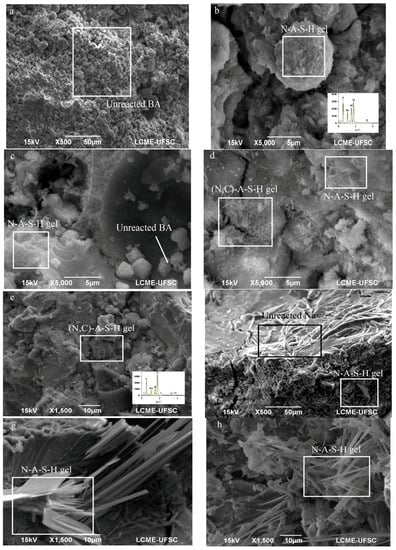 The SEM images presented in Figure 13 show sample OPC 0, a high content of unreacted BA. Because of its lack of silicate presence, there was no N-A-S-H gels and no (N,C)-A-S-H gels, in large part due to the absence of CaO. Figure 13b shows OPC 2.5 and its presence of N-A-S-H gels with no traces of calcium phases. Figure 13c displays OPC 5, as well as particles of unreacted BA. Figure 13d presents OPC 10, which had traces of calcium in geopolymer gels, the forming gel (N,C)-A-S-H. Figure 13e presents the same gel with calcium, for OPC 30. Figure 13f shows RHA 25 with unreacted sodium and the gel N-A-S-H. Figure 13g and h show RHA 50 and RHA 75, respectively, both featuring long crystals of gel N-A-S-H.