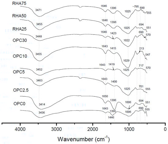 Figure 14 shows the 28 days FTIR spectra for binary and ternary mixtures. The bending vibration (547–570 cm−1) corresponded to the Si-O-Al bonds. The wavenumber 690–717 cm−1 was attributed to Si-O symmetrically stretching vibrations []. The spectrum band at ~795 cm−1 was attributed to quartz, except for sample OPC 0 [,]. The vibration corresponding to N-A-S-H gel band (T-O, where T = Si or Al) was seen at 1006–1029 cm−1 []. Higher Portland cement content increased the band intensity, indicating an increase in gel formation. Also, the increment of OPC content shifted the band to a higher wavenumber, which we attributed to a replacement increase of AlO4 to SiO4 tetrahedron. For ternary mixes, an increased RHA content reduced the intensity of N-A-S-H gels.