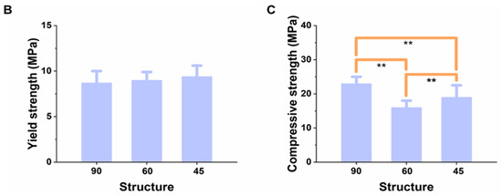 (A) Printing path, macro—as well as micro—morphology of the PLGA scaffolds. Change of (B) yield stress, and (C) compressive strength, at various printing angles. The size of the scaffolds was 10 mm × 10 mm × 4 mm, with an area of error of about ±0.05 cm2, (n = 5). ** represents p < 0.01.