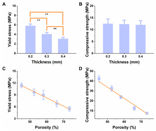 Change of (A) yield stress, and (B) compressive strength at a varied thickness (0.2, 0.3, and 0.4 mm) and porosity (45%, 52%, 59%, 66%, and 73%), (n = 5). Change of (C) yield stress, and (D) compressive strength at a varied porosity (45%, 52%, 59%, 66%, and 73%),** represents p < 0.01.