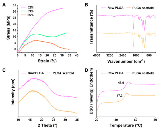 (A) Strain-stress curves at different porosity levels of the scaffolds. (B) FTIR spectra, (C) XRD curves, and (D) the DSC curves of the raw PLGA and the PLGA scaffold.