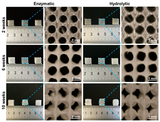 Biodegradation is the most crucial property to be considered while preparing biomedical devices. Moreover, the initial understanding of the degradation process of TE scaffolds is critical, as it plays a significant role in utilizing them and determining their tissue regeneration efficacy [49]. It should be noted that, more often, the ideal scaffolds used for engineering tissue should possess controllable degradation, whose degradability rate should be rehabilitated to the speed of the tissue regeneration process [50]. In this study, scaffolds fabricated at few optimized parameters, were subjected to degradation studies in various fluids, such as normal buffers (hydrolytic) and enzyme-dispersed buffers (enzymatic) mimicking the physiological fluids. Furthermore, various physicochemical attributes were also measured, such as changes in weight, mechanical properties of the scaffolds, and the pH of the medium, correlating the effect of the medium on the scaffolds. It is evident from Figure 4 that the scaffolds had resulted in a change of color, i.e., becoming white from the original transparency, which revealed the signs of degradation of the scaffold. In addition, the regular size of the pores was also disordered, resulting in an increase of the scaffold volume. These consequences might be due to the interaction of the scaffolds with the water molecules, and gradual decomposition of the material, into small molecules. At the early stages of degradation (at 2nd week of incubation period), the morphology of the scaffold remained regular and complete. However, a slight disintegration began in the next four weeks (at 6th week of incubation period). Moreover, the texture of the scaffold began to become more fragile, and the scaffold began to deform from 10th week, in both enzymatic as well as the hydrolytic degradation media.