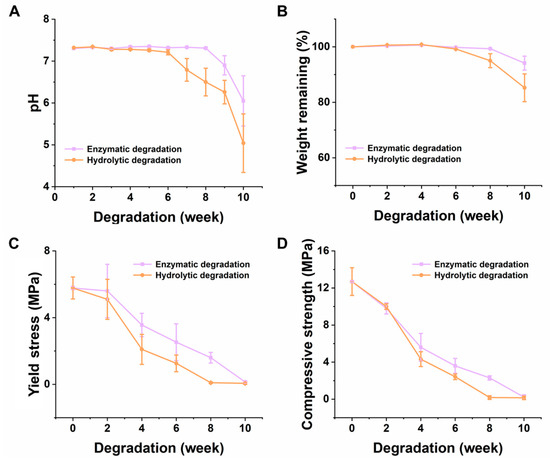 With the degradation of the scaffold in any medium, the mechanical properties of the scaffold gradually become poorer. Thus, this trend of the mechanical properties of the scaffolds could also be used to correlate the degradation rate of the scaffolds. Figure 5C,D shows the decreasing levels of the yield stress and the compressive strength of the scaffold, gradually, with time. The overall degradation rate was consistent, and the degradation trend in the hydrolysate and in the enzymatic, was approximately the same. However, the rate of degradation in the hydrolysate was faster than that in the enzymatic study, after 4 weeks. The compressive strength decreased from 12.69 MPa to 0.22 MPa and 0.15 MPa, in the enzymatic and hydrolytic media, respectively. A similar trend was evidenced in the case of the yield stress of the scaffolds, which decreased from 5.78 MPa to 0.14 MPa and 0.06 MPa, in the enzymatic and hydrolytic media, respectively. This might be due to the change of the molecular weight caused by the hydrolysis of the ester bond, in the degrading solution. This could have directly led to the worsening of the mechanical properties, due to the gradual change in the texture of the scaffolds and the weakening of the intermolecular forces [54,55]. However, it should be noted that when the scaffold is implanted in the body, as it would get degraded, new tissue would gradually replace the empty space in the scaffold, and the space produced by the degradation, and strengthen the supporting effect. Generally, a fibrous matrix is formed in the first three weeks, which effectively alleviates the damage caused by the decrease of mechanical properties, in the later period. Therefore, the rate of degradation of prepared scaffolds is suitable for providing support in the first three or four weeks, leading to no harmful effects during the formation of new tissue [56].