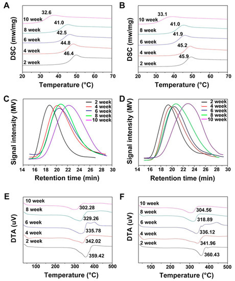 (A,B) DSC curves, (C,D) molecular weight distribution, and (E,F) DTA curves of the enzymatic (A,C,E) as well as the hydrolytic (B,D,F) degradation studies.