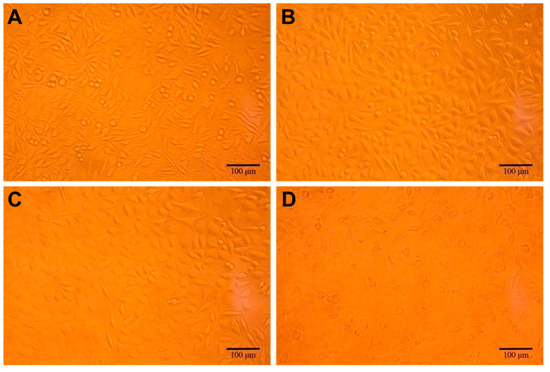 An optical micrograph of L929 cells cultured for 72 h, at different concentrations of 3D printed PLGA scaffold extract. (A) Negative control, (B) 50 mg/mL, and (C) 100 mg/mL of the PLGA scaffolds as the treatment group, and (D) Positive control (Phenol).