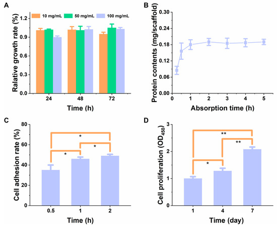 (A) The relative growth rate of L929 cells on the PLGA scaffold. The concentrations of the scaffold leaching solution were 10, 50, and 100 mg/mL, respectively. (B) Protein adsorption efficacy onto the scaffold at different time intervals. (C) Cell adherence rate and (D) proliferation rate on the scaffold, at different time intervals, (n = 5). * represents p < 0.05, ** represents p < 0.01.
