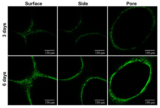 To understand the growth, as well as the distribution of cells on the scaffold, more intuitively, an acridine orange solution was used to stain the scaffold-cell complex, after 3 and 6 days of incubation, and then the scaffolds were observed under the CLSM. The images showed that the cells grew normally on the scaffold and distributed more evenly (Figure 9). With the increase of the culture time, the number of cells increased gradually, and the activity was high, which could be attributed to the biocompatibility of the scaffolds, which played a crucial role in promoting the healthy growth of cells.