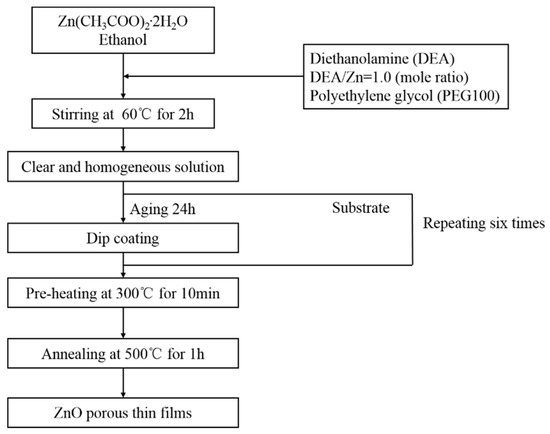 First, the zinc acetate dihydrate was poured into ethanol and then stirred by a magnetic stirrer at a constant temperature of 60 °C to be mixed fully. After 10 min, diethanolamine (DEA) was dropped into the mixed solution within 30 s. The molar ratio of DEA:zinc acetate was always 1.0:0. Then, 1.0 g of polyethylene glycol (PEG1000) was added to the solution as a polymeric porogen. In the solutions, the concentrations of Zn2+ were 0.2 M, 0.4 M, 0.6 M, 0.8 M, and 1.0 M, respectively. A clear and homogeneous solution was obtained after stirring for 2 h at 60 °C. Finally, the homogeneous solution was baked for 24 h. The substrates were washed successively with acetone, methanol, and deionized water. ZnO porous thin films of different sol concentrations were dip-coated on the cleaned substrates with a drawing speed of 6 cm/min. While dipping, we maintained 60 s for residence time to ensure that the film could be coated onto the substrate. After this procedure, the films were directly preheated at 300 °C for 10 min so as to steam the solvent and remove any organic substances. The processes, from dip-coating to preheating treatment, were repeated six times so that the film reached the desired thickness. Finally, the substrates were heated at 500 °C for 1 h using heating rates of 2 °C/min in air to obtain ZnO porous thin films. The procedure used for preparing the ZnO thin films is shown in Figure 1.