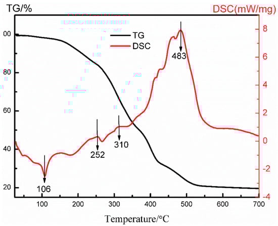 Figure 2 depicts the thermal behaviors of the ZnO xerogel using a thermal analyzer in air at a heating rate of 10 °C/min. Four-step weight losses were found in the TG curve corresponding to 25–150 °C, 150–420 °C, 420–500 °C, and 500–700 °C, respectively. About 3.3% of the first-step weight loss was assigned to the evaporation of ethanol and water. The second-step weight loss was about 63.3% and originated from the disintegration and the inflammation of the DEA and the PEG1000. In the third step, the combustion of the remnants was the main reason for the weight loss of 12.6%. Finally, it was found that no weight loss appeared above 500 °C. One endothermic peak at 106 °C and three exothermic peaks at 252 °C, 310 °C, and 483 °C in the DTA curve corresponded to the above four weight losses, respectively. There was an especially huge exothermic peak at 483 °C, which may have led to the crystal transformation of ZnO from an amorphous state to a wurtzite phase. The results show that an annealing temperature of 500 °C would be suitable for fabricating ZnO thin films.